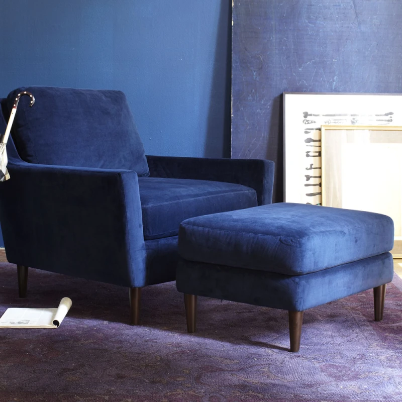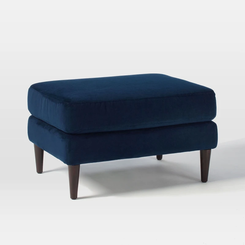 An accessory designed to provide support and comfort to your feet when they are sitting down. It has clean lines, simple shapes, and a minimalist aesthetic. It features a streamlined and uncluttered appearance. The materials chosen not only add to durability but also contribute to a modern and sophisticated look. It is designed to be compact and space-saving. Its blue color velvet fabric adds a finish to match your personal style and the existing decor in your space.
